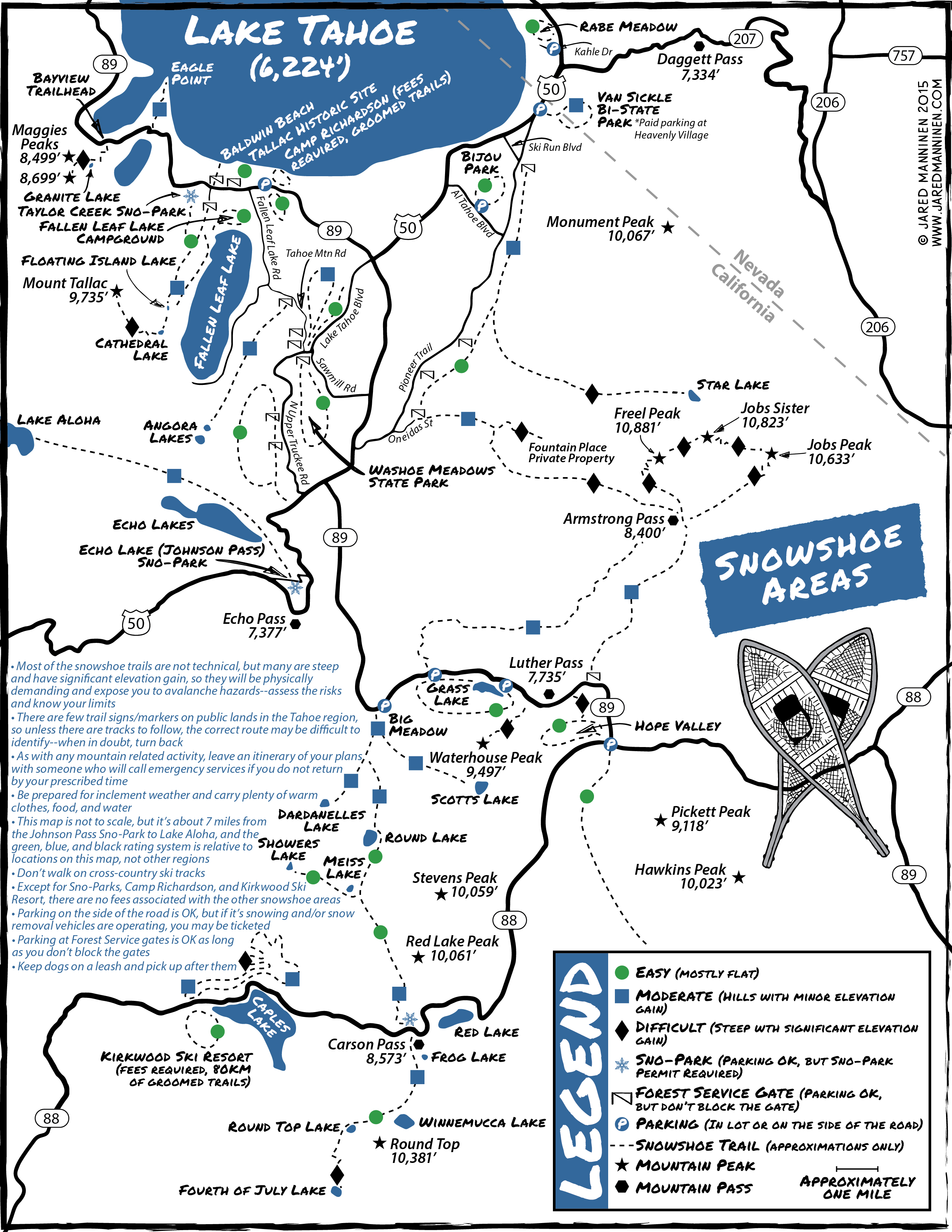 The most accessible hikes, denoted on the map by green circles, are on reasonably level terrain with little to no incline and generally low avalanche risk. More advanced routes include rolling hills with moderate angles, denoted by blue squares. The most difficult snowshoeing terrain is steep and will get your cardio going. Marked by black diamonds on the Tahoe Trail Guide map, they also necessitate being avalanche savvy.